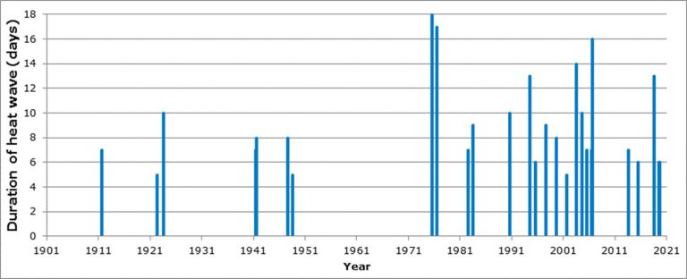 De bovenstaande figuur laat zien dat de lengte van hittegolven in Nederland is toegenomen. Dit effect is zelfs sterker dan de gemiddelde temperatuurstijging. De oorzaak hiervan is onbekend.