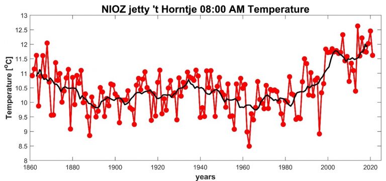 De atmosferische temperatuurstijging zien we ook terug in de zeewatertemperatuur, hierboven weergegeven voor de Nederlandse Waddenzee (gemeten bij de steiger van NIOZ Texel).