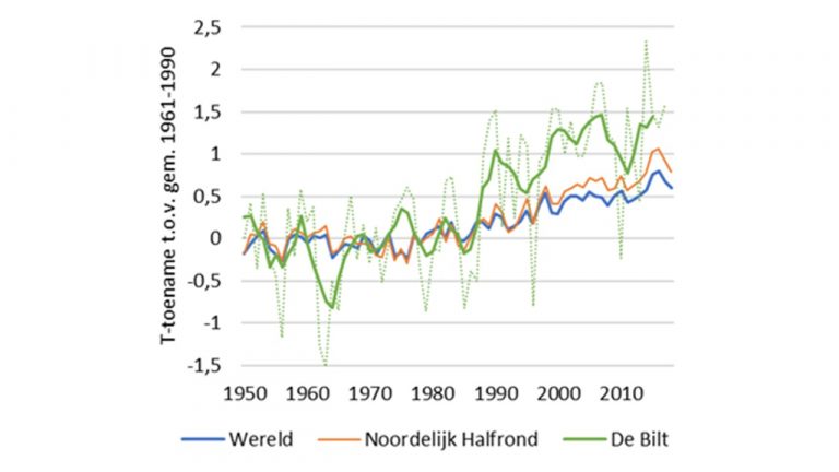 De relatief sterke (Noord-)Europese temperatuurstijging is ook terug te zien in de Nederlandse metingen. Zie de figuur hierboven.