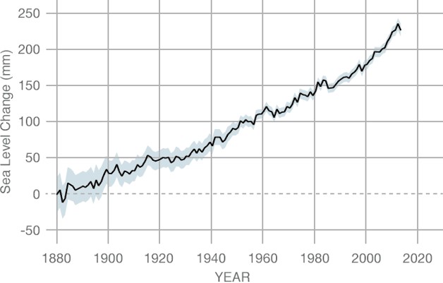 De bovenstaande figuur toont de mondiaal gemiddelde zeespiegelstijging sinds het begin van de metingen. In cijfers:
