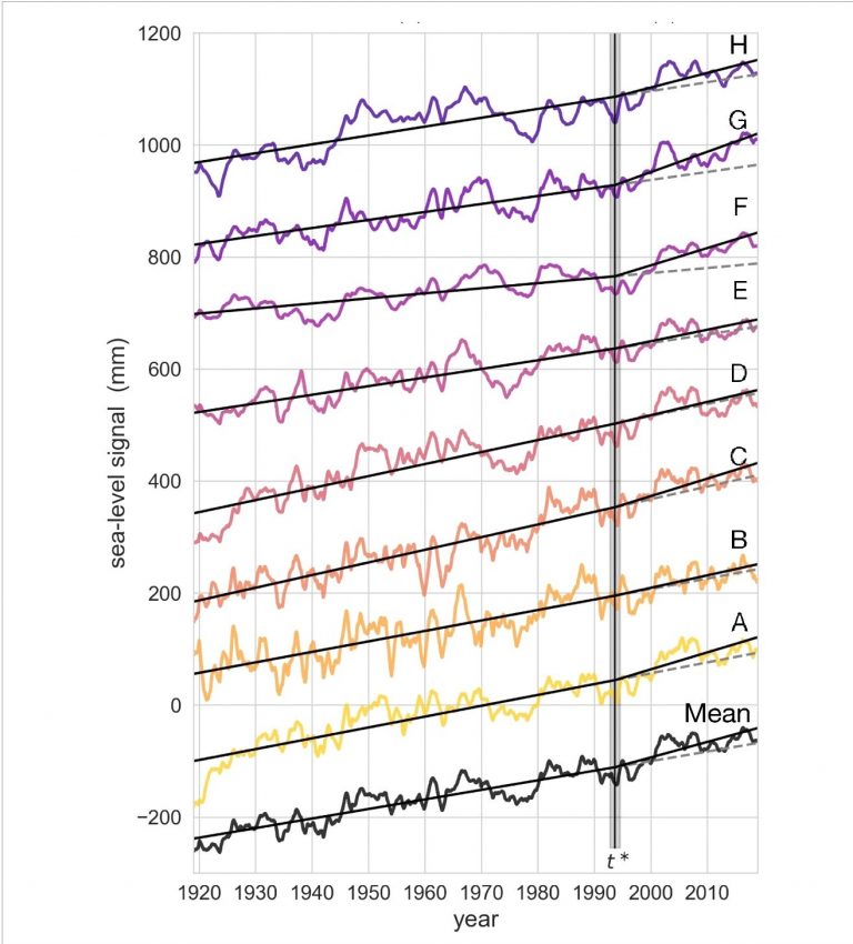 Ook langs de Nederlandse kust wordt, sinds circa 1993, een versnelling van de zeespiegelstijging waargenomen (zie bovenstaande figuur, met de locaties van de meetstations apart weergegeven). In cijfers, voor de gemiddelde trend  van de zeespiegelstijging langs de Nederlandse kust: