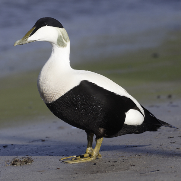 Somateria mollissima. Deze grote eend komt voor van de poolstreken tot west europa. De soort is aangepast aan de kou en vindt in Nederland en omstreken de zuidgrens van zn broedverspreiding. Dit is een waddenzeesoort, maar is voor zn voedsel (schelpdieren die duikend worden bemachtigd) afhankelijk van de noordzeekustzone.